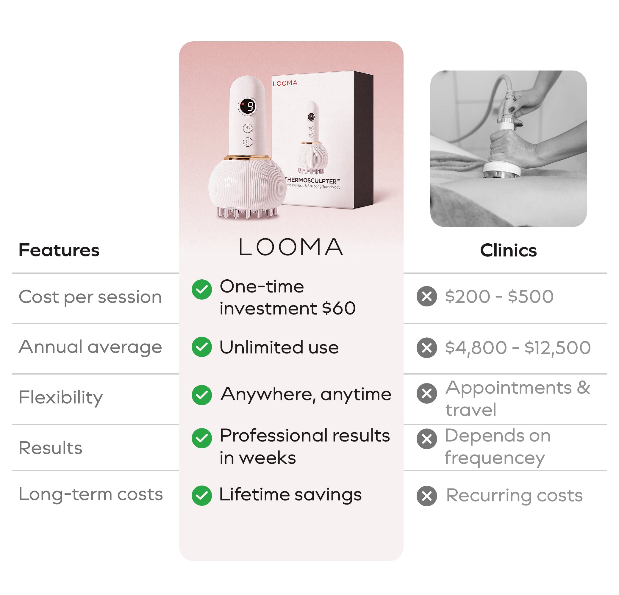 Kaye C. August 2025Verified BuyerReal results in a few weeksI was skeptical about another at-home gadget, but within a month the skin on my thighs looked smoother and my jeans fit better. I can literally see less dimpling and feel more toned.Looma ThermoSculptor™ Was this helpful? 0 0